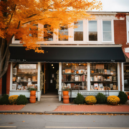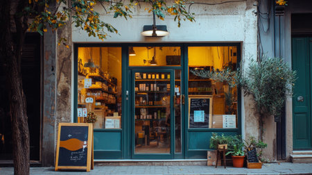 An inviting storefront of a local shop with warm lighting and plants adorning the entrance. The ambiance reflects a charming and rustic small business.
