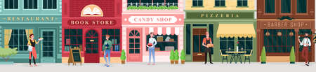 City street store, catering service vector illustration set. Cartoon cute retro storefront building facade with seller people collection, pizzeria restaurant bookstore candy shop barbershop background
