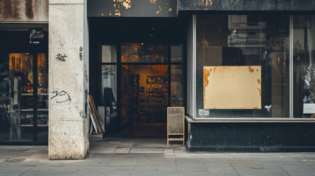 A captivating urban storefront featuring elegant gold accents and an empty display board, inviting passersby to explore the intriguing interior space.