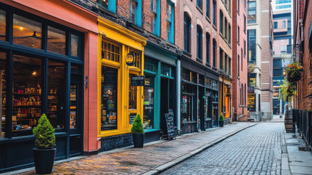 This image captures a vibrant alleyway in an urban setting, showcasing colorful buildings and charming storefronts lined along cobblestone streets.