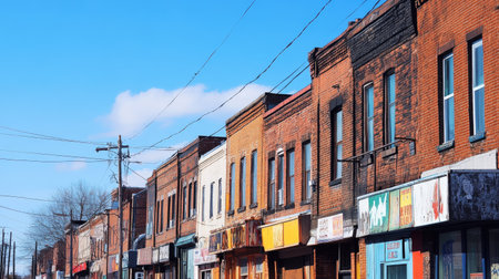 A row of old brick storefronts with vintage signage under a bright blue sky.