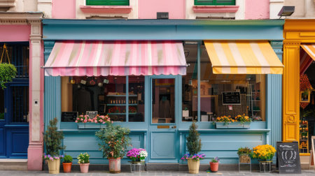 Vibrant storefront with colorful awnings, potted plants, and sidewalk chalkboard