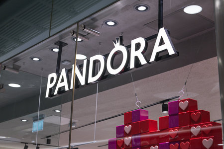 Pandora Jewelry Store Sign with Valentines Day Display. London, UK, 17 February 2024
