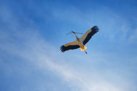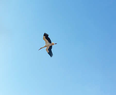 White migratory bird fly on blue sky background. Flight stork Freedom animal concept.