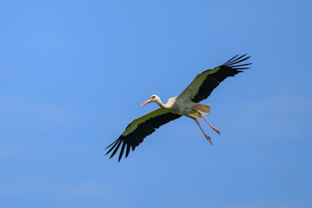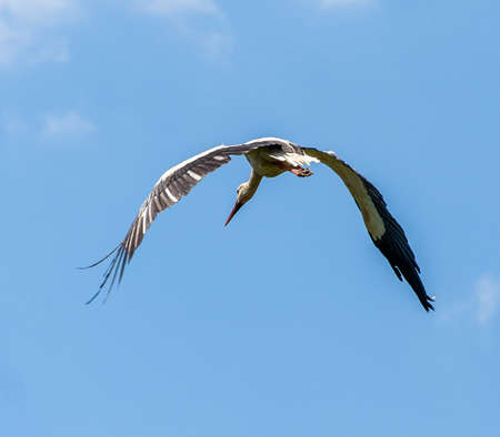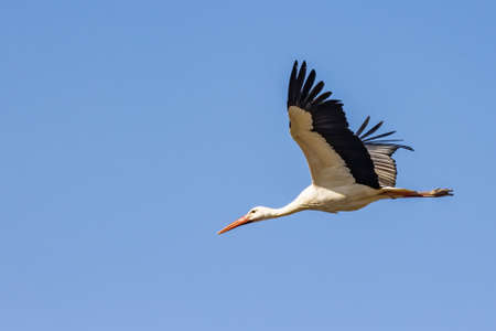 A White Stork in flight on a sunny day in springtime, blue sky, Lower Austria