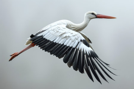 A stork glides over a foggy scene, its wings spread and bright red beak shining