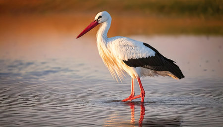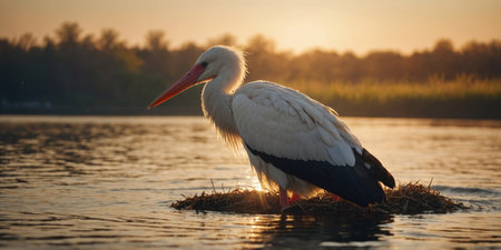 AI Generated. Stork preening in golden hour light by the water