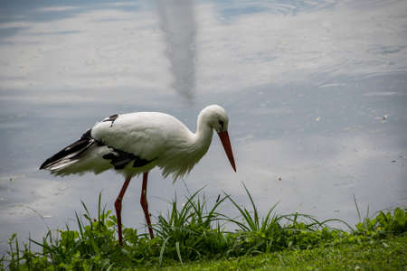 Portrait of a stork in the wild on a background of green grass near the lake. Birds and wild bird watching in nature.