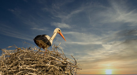 A stork stands in its nest, Builds the nest. A dramatic blue sky in the background. copy-space. High quality photo