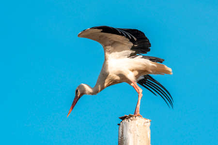 Stork starting flight from electric pole . This white with black bird is very elegant.