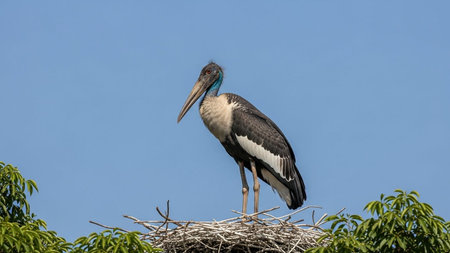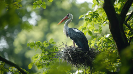 A great stork nesting in a tall tree, its puffy neck pouch visible against the vivid green canopy.