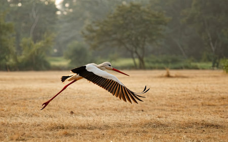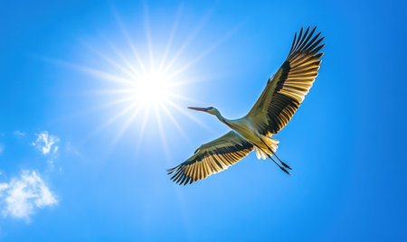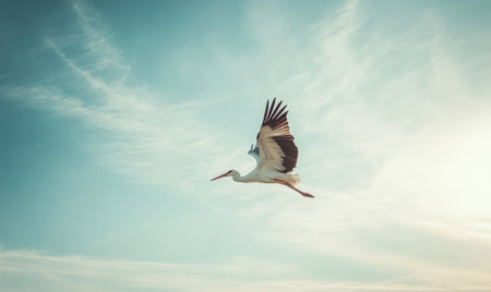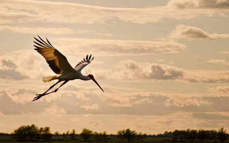 A stork flying gracefully, soft light shining on its wings