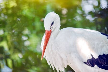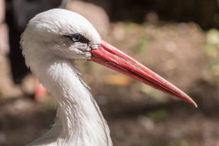 White stork with a long pointed red beak. Portrait close up