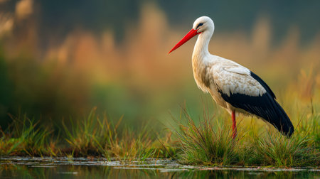 Serene stork in misty wetland at sunrise. That the image is generated using AI.
