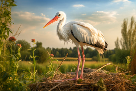White stork standing on a nest in a meadow at sunset. Generative AI.