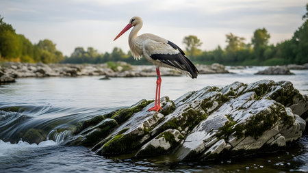 A majestic white stork standing on a mossy rock in the middle of a flowing river. The bird is captured in profile against a blurred background of trees and water, highlighting its long red legs and beak.