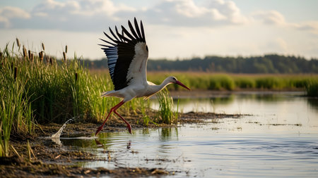 A majestic white stork takes flight from a shallow wetland, its wings fully spread and water splashing beneath its feet. The scene is set against a backdrop of reeds and soft evening light, capturing the grace of the bird in motion.
