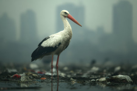 A solitary stork stands in a polluted marsh filled with trash, reflecting the impact of urbanization on wildlife. The foggy skyline looms in the background.