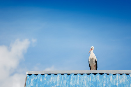 Black and white storks on roof, blue sky background
