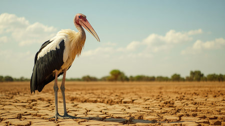 Marabou stork (Mycteria leucocephala) standing on dry cracked earth.