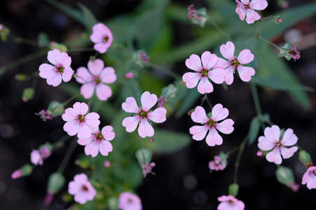 Close up of small pink flowers in the garden. Shallow depth of field.