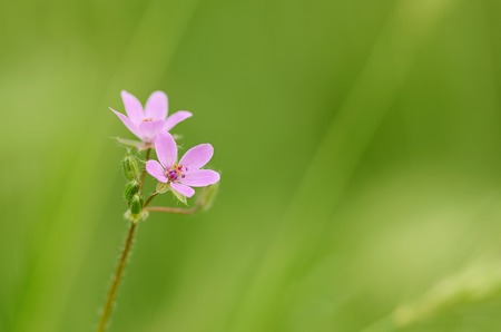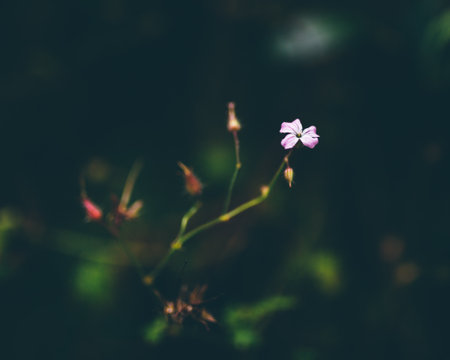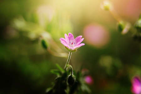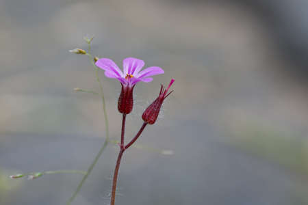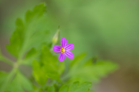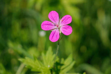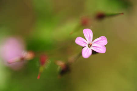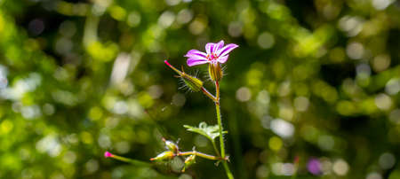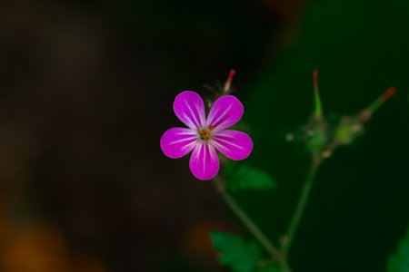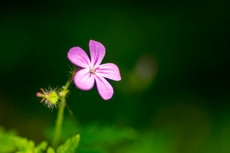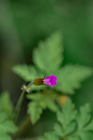 Beautiful flower of Geranium Luciudum or mountain geranium with very defocused natural background, commonly known as herb-Robert, red robin, death come quickly, storksbill, fox geranium, stinking Bob, squinter-pip, crow's foot, or Roberts geranium, detail.