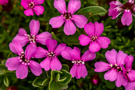 Saponaria ocymoides flower growing in mountains, macro