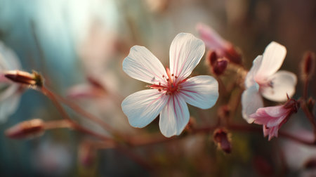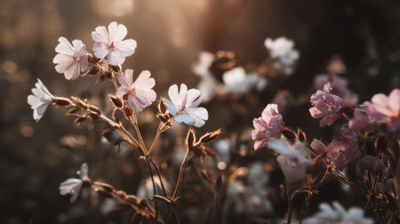 A captivating image showcasing delicate blooming flowers illuminated by soft evening light, creating a serene and tranquil atmosphere ideal for nature-themed projects.