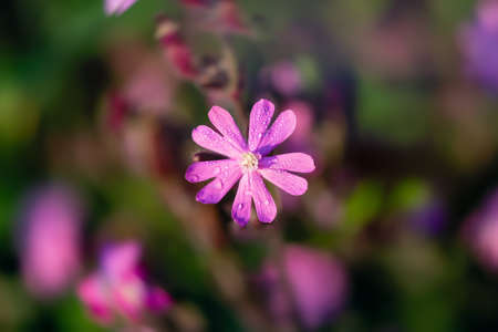 Flowers of a perennial plant Silene dioica known as Red campion or Red catchfly on a forest edge in the summer sunset, close-up