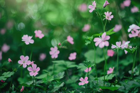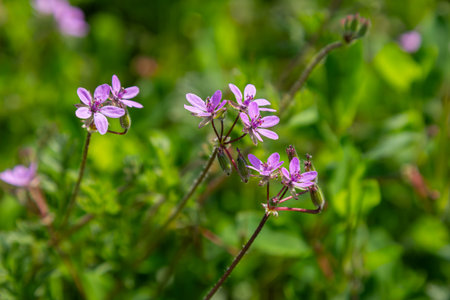 Delicate pink flowers of Erodium cicutarium flourish in a lush green meadow under bright sunlight creating a striking contrast during the early spring season.