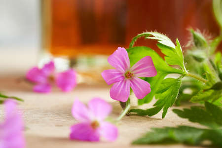 A bottle of herbal tincture with fresh blooming herb-Robert plant on a table