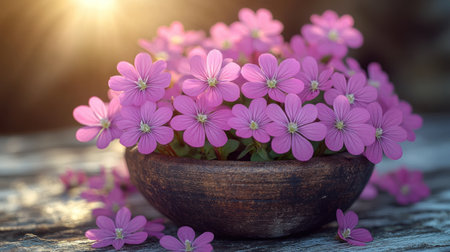 A bowl of pink flowers rests on a worn wooden table, glowing in warm light.