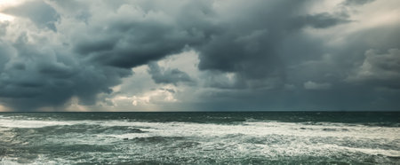 Stormy sea. Dramatic seascape. Epic cloudscape. Panoramic image