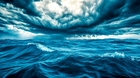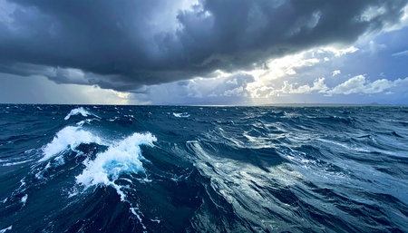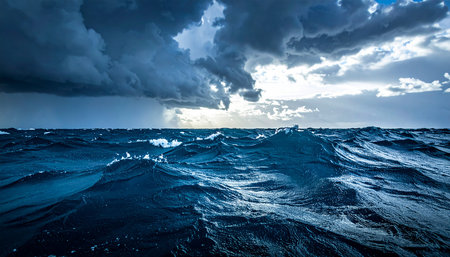 Dark clouds gathering over deep blue ocean waves symbolizing calm before storm