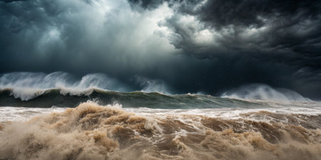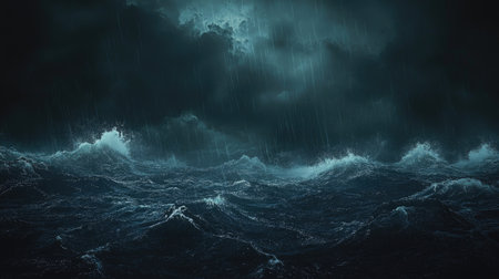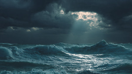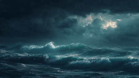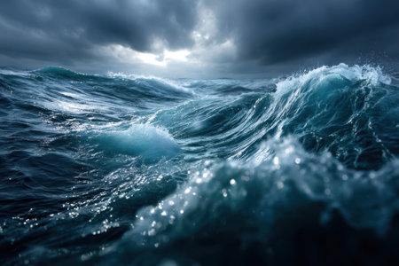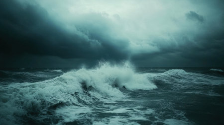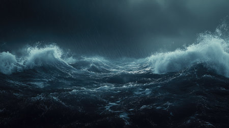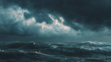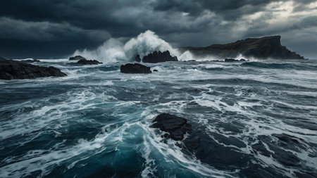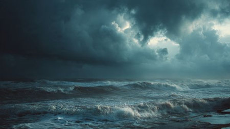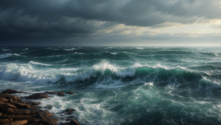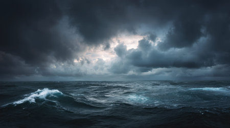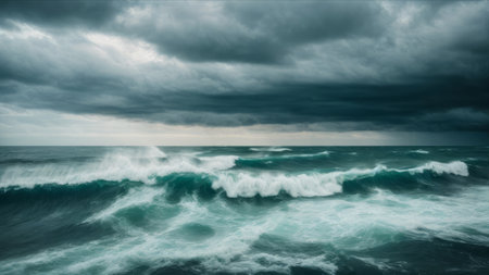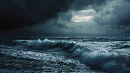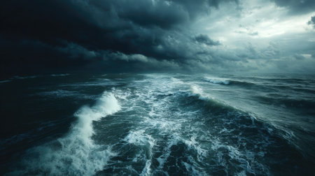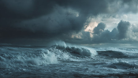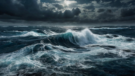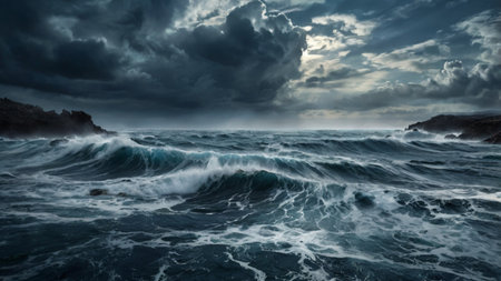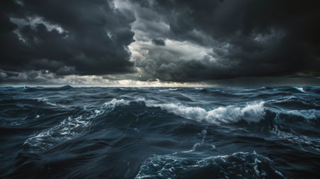 A Stormy ocean with massive waves under dark clouds