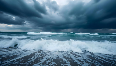 A captivating view of a stormy sea showcases dark clouds hovering above powerful waves crashing onto the shoreline. The scene embodies nature's raw force and beauty.
