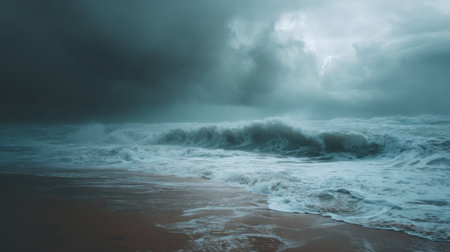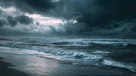 A captivating seascape showcases turbulent waves crashing onto the sandy beach, set against dark, dramatic clouds. The atmosphere evokes a sense of tranquility yet awe, perfect for nature and landscape themes.