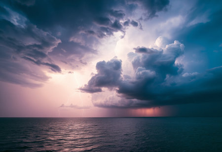 Heavy storm clouds forming over a vast ocean, with rain falling and seas heaving generative ai