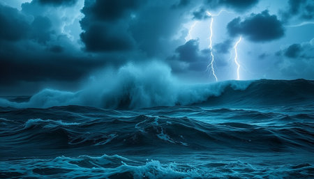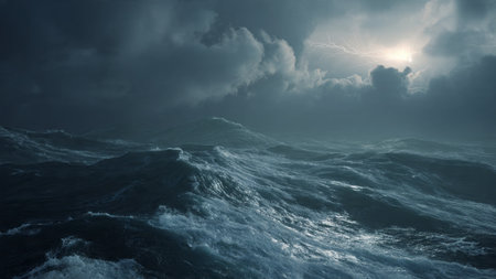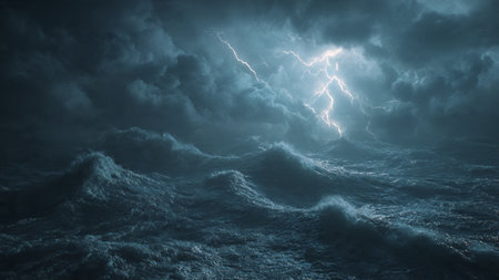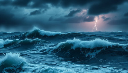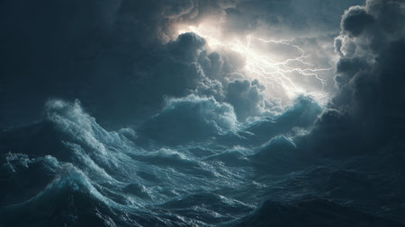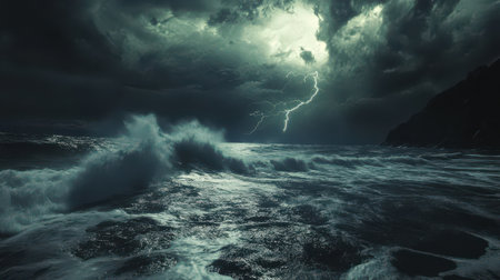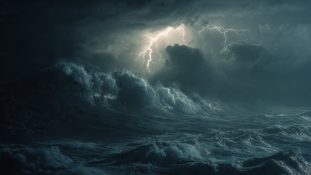 Turbulent ocean waves crash violently under a dark, stormy sky with dramatic lightning illuminating the chaotic...