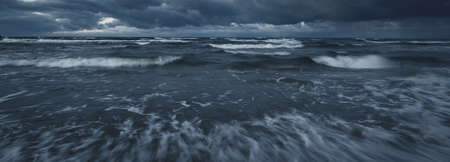 Stormy sea. Dramatic sky, stormy ocean waves. Epic seascape. Panoramic view