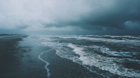 A captivating seascape showcases turbulent waves crashing onto the sandy beach, set against dark, dramatic clouds. The atmosphere evokes a sense of tranquility yet awe, perfect for nature and landscape themes.