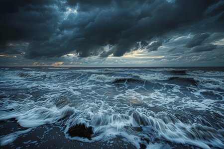 A captivating view of a stormy sea showcases dark clouds hovering above powerful waves crashing onto the shoreline. The scene embodies nature's raw force and beauty.