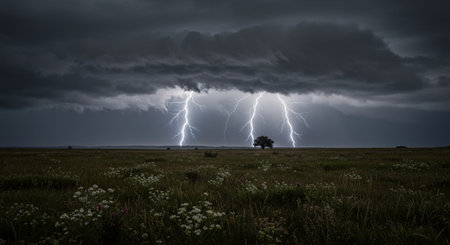 Thunderstorm over a meadow with a lone tree on the horizon