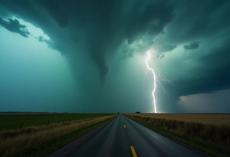 A menacing storm cloud spirals ominously above an empty rural road, while a brilliant bolt of lightning illuminates the darkening sky, signaling an impending tornado.