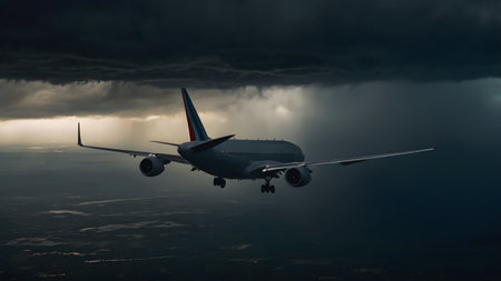 A commercial airplane flies amidst dark storm clouds, illuminated by vivid lightning strikes during a turbulent weather event.