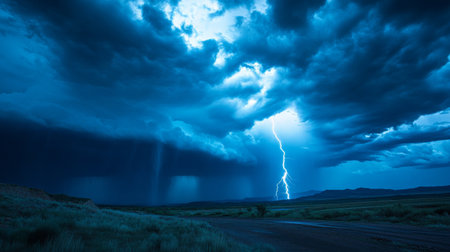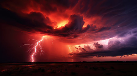 Dramatic sky with forked lightning illuminates dark rural landscape generated by artificial intelligence