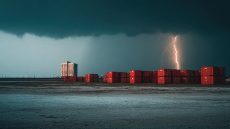 A breathtaking scene of a thunderstorm capturing lightning striking near shipping containers and a tall building, showcasing the contrast between nature and urban life in a dramatic landscape.
