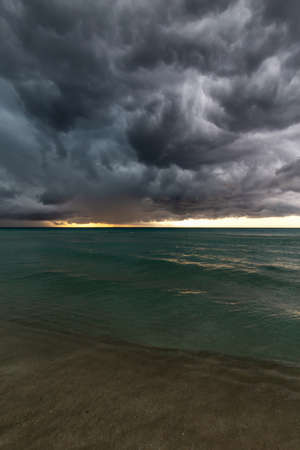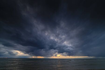 Dramatic thunderstorm over the sea at sunset. Nature background