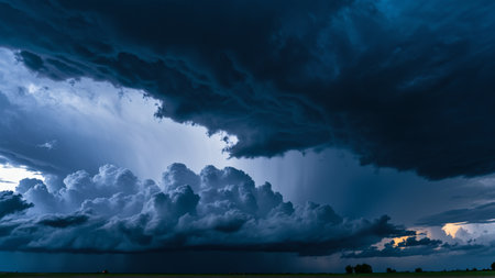 Dark blue storm clouds with heavy rain falling create a dramatic, moody atmosphere over a distant horizon under a...