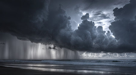 Storm clouds loom over the ocean, casting shadows on turbulent waters. Rain cascades down from the clouds, creating a dramatic scene on the beach as waves crash onto the shore.